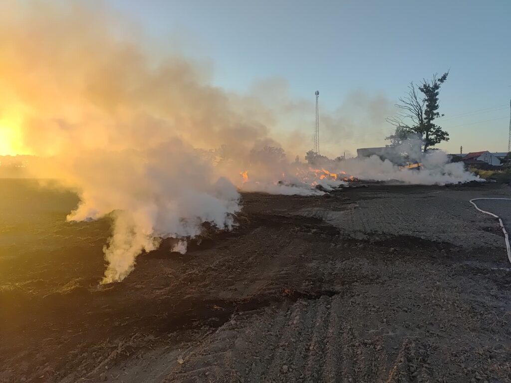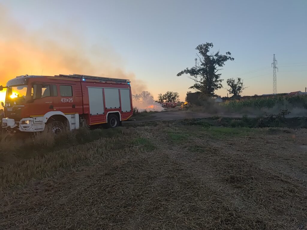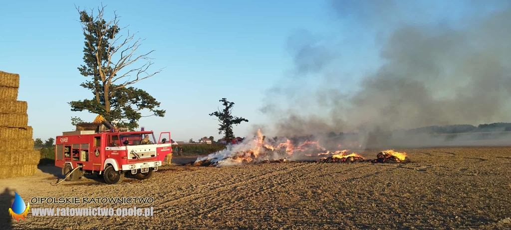 Kierujący ciągnikiem, po zjechaniu z drogi na pobliskie pole w celu rozładowania balotów, zauważył ogień w jednej z przyczep. Reagując błyskawicznie, przy pomocy ładowarki teleskopowej zrzucił bele słomy, aby powstrzymać rozprzestrzenianie się pożaru.