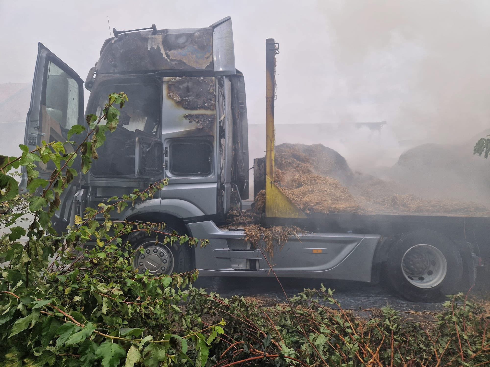Po dojeździe strażacy zastali pojazd objęty ogniem wraz z ładunkiem słomy. Ogień rozwijał się bardzo dynamicznie, powodując intensywne zadymienie widoczne z dużej odległości.