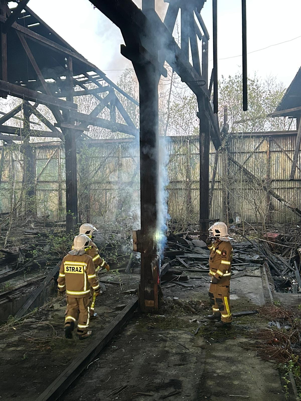 Pożar rozwijał się wewnątrz zrujnowanego obiektu, co stwarzało dodatkowe zagrożenie ze względu na możliwość zawalenia się elementów konstrukcyjnych.
